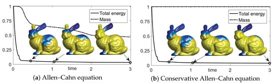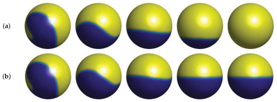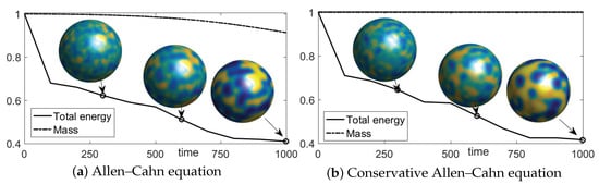 Spinodal decomposition is a mechanism by which a solution of two or more components separates into different phases. The system separates into spatial regions rich in one species and poor in the other species and evolves into an equilibrium state with a lower overall free energy [,]. In this section, we will consider this problem for the Allen–Cahn equation and conservative Allen–Cahn equation with the initial condition on a sphere surface. Here is a random number between and 1. The calculation is run until with time step . We chose and . Figure 1a,b show the evolutions of spinodal decomposition of the Allen–Cahn equation and conservative Allen–Cahn equation, respectively. Observing these results, we can see that the positive phases are separated and gathered together. At the early stage, the evolutions with two methods are similar because the effect of the phase separation is dominant. Once the positive phases are fully separated, the dynamics of two equations become significantly different. On the later stage, the pattern of the phase deforms to a bar shape and shrinks with increasing speed, because the Allen–Cahn equation has the motion of mean curvature flow []. On the other hand, the bar shape remains due to the mass conservation of the conservative Allen–Cahn equation [].