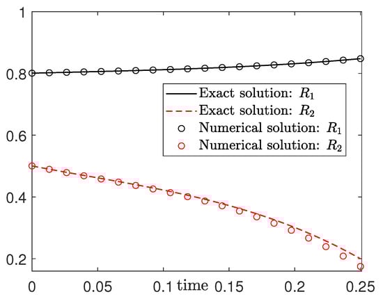 The comparison and between exact solution and numerical solution are drawn in Figure 5. Note that the analytic solutions of and are obtained by the fourth–order Runge–Kutta method []. The result shows that the numerical solution is close to the exact solution.