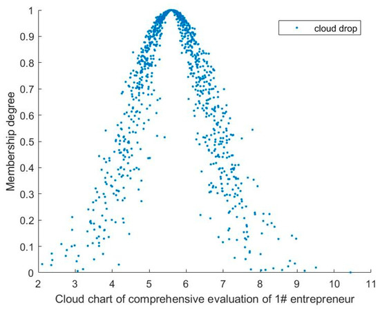 The FCG was used to carry out 1000 times random simulation calculations to generate cloud drop and membership degree based on , taking as the horizontal axis and as the vertical axis, and we can draw a cloud chart of the comprehensive evaluation results as in Figure 2. As can be seen from Figure 2, the expected value of uncertainty tolerance of the 1# entrepreneur is 5.6032, and the cloud drops near this value are the most and densest. We can also see that the cloud drops between the range of 6 and 8 are also relatively dense. Therefore, we can define that the degree of uncertainty tolerance of 1# entrepreneur should be above medium.