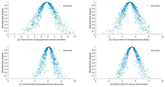 The cloud chart of the evaluation results of four primary level indexes are shown in Figure 3. As can be seen from Figure 3, the 1# entrepreneur performs best in terms of entrepreneurial resources, but the worst in entrepreneurial ability. In addition, we can see that the cloud drops of (a) and (b) in Figure 3 are more dispersed than those of (c) and (d), which indicates that experts’ views on evaluation of the entrepreneur’s physical and mental condition and entrepreneurial ability are more different than entrepreneurial resources and the macro environment.