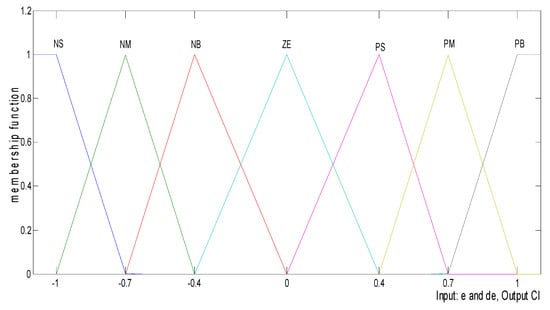 By using the set of linguistic fuzzy rules, its mechanism can produce the appropriate action for fuzzy control. The mechanism comprises one comparable control module and one input/output component: two inputs signal e(t) and de(t) and one output signal eFuzzy(t). To reduce the system error, ke(t) and kde(t) were employed. The fuzzification method: the center of the area is utilized to minimum values of the Fuzzy Mandani type, hence, 7 × 7 fuzzy rules are expressed in Table 1. Because this combination yields basic execution factors of the fuzzy control rules, seven partitions were formed: negative large (NL), negative medium (NM), negative small (NS), zero (ZE), positive small (PS), positive medium (PM), and positive large (PL).
