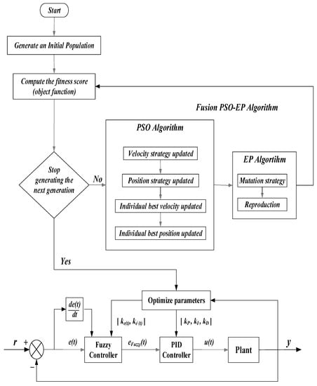 Fusion particle swarm optimization–evolutionary programming (PSO–EP) algorithm and reinforced fuzzy-PID (proportional integral derivative) controllers.
