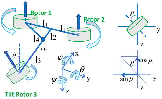 The UAVs possessing the property of vertical take off and landing (VTOL-UAVs) will have the formation like a helicopter or drone/quadrotor, hexa-copter or octo-copter. Nevertheless, more rotors lead to a more risky operation and higher power consumption. Hence, this paper presents a novel tricopter UAV that may be applied successfully to agriculture activities at any environment. Agricultural Tricopter model, based on the Newton–Euler formulation was developed and obtained from previous studies [,,,,,], as shown in Figure 3. The UAV was described using two left-hand axes—one is the axes of the Earth coordinate system, and the other is a body frame. The positive x axis is aligned with the two front rotors (rotor 1 and 2) and the positive y axis is with the right (rotor 2). However, the positive z axis is directed downward. The roll φ, pitch θ, and yaw ψ triple pilot angles were with the positive x, y, and z axes, respectively. The tilt angle μ was determined by using the y–z coordinate axis.