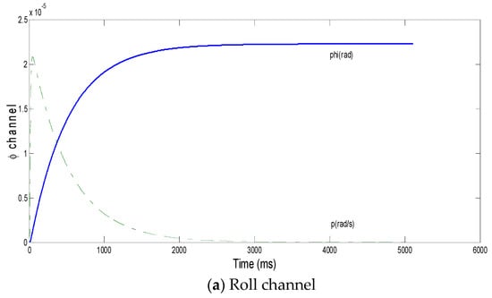 The object simulation parameters that are listed in Table 3, were derived from previous studies [,,]. However, the value of the tilt angle µ should be negative in the initial condition to maintain system stability. The simulation pilot controls are demonstrated in each channel RPY (roll, pitch, and yaw). The speed of each rotorcraft that was determined using the Newton–Raphson method is as follows: Ω1 = 8418 rpm, Ω2 = 8418 rpm, Ω3 = 8676 rpm. Moreover, the tilt angle μ is −0.0210 rad (−2.407°).