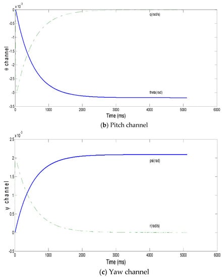 Tricopter hovering mode with linear quadratic regulator (LQR) control in each channel: (a) roll, (b) pitch and (c) yaw.