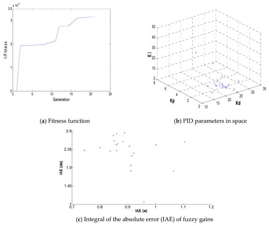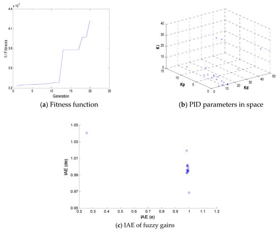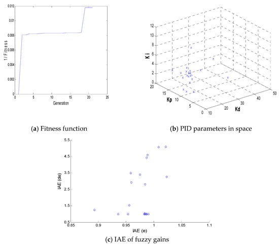 According to the pilot angle control of a UAV in the roll (Figure 5), Pitch (Figure 6), and Yaw (Figure 7) axes of each channel, we exhibited a useful system model as follows: (a) The fitness function of the proposed controller design. The fitness function is smaller (or the inverse fitness is larger) mean that the optimal convergence is better. (b: top right) PID parameter in three dimensions convergence space. The convergence of PID gains is chosen in the range [0–50]. (c: middle) The minimum of IAE(e) and IAE(de) in two dimensions. The convergences of fuzzy gains are selected and performed in 2D. (d) Response of the controllers.