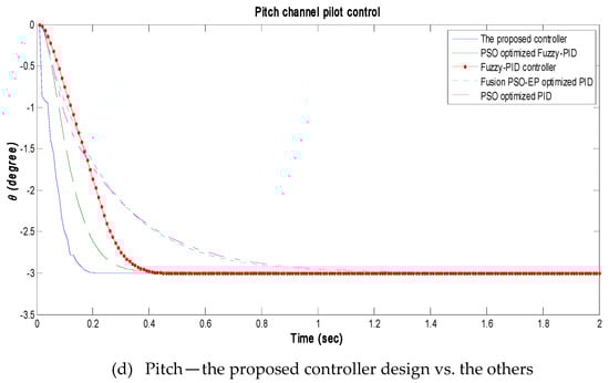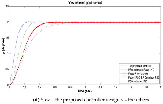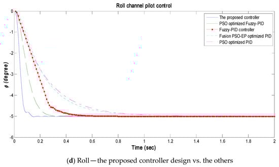 The parameters of the fusion PSO–EP algorithm are provided when the number of population generations for each of the roll, pitch, and yaw angle pilot controls is set as 20 generations. The EP mutation rate mr is 0.1 and the deceleration factor of the particle σ = 1. The weighting factor [α1, α2, α3, α4, α5, α6, α7] = [30, 25, 10, 5, 7, 5, 3], and PID gains kPID ϵ [0, 50]. The simulation sampling time is 0.01. The fuzzy-PID controller gains obtained after tuning through the Ziegler–Nichols method are as follows: kP = 0.6, kI = 0.34, kD = 0.28, ke(t) = 1.23, kde(t) = 1.58 and the fitness perform index IAE = 0.9208.