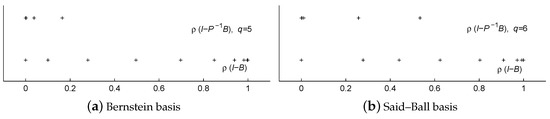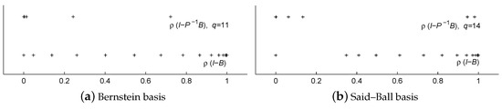 The spectral distributions of and resulting from Bézier curves and Said–Ball curves in Examples 1–3 are illustrated in Figure 1, Figure 2 and Figure 3, respectively. From those figures, we can see that most of the eigenvalues of the preconditioned iteration matrices are far away from 1 and clustered around 0 in each of six cases.
