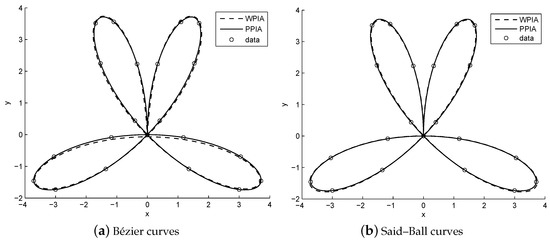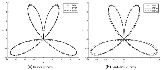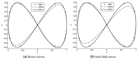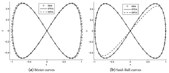 From Table 6, Table 7 and Table 8, we can see that the IPPIA converges much faster than the WPIA and DWPIA. For example, when we fit the points sampled from the lemniscate of Gerono by using Bézier curves, we observed that the errors caused by performing 5 IPPIA iterations are about the same as those caused by performing 137 WPIA iterations or 381 DWPIA iterations. Again, when we fit 53 points sampled from the lemniscate of Gerono by using Said–Ball curves, we found that the errors caused by performing 4 IPPIA iterations are about the same as those caused by performing 291 WPIA iterations or 358 DWPIA iterations. Furthermore, under the requirement of the same accuracy, the runtime of IPPIA iterations was less than that of WPIA iterations and it was comparable to that of DWPIA iterations.