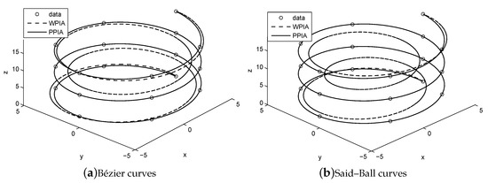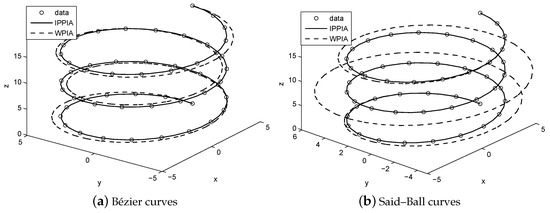 From the above numerical experiments, we know that the PPIA works much better than the WPIA and DWPIA if the number of the interpolating points is moderate. However, when we fit 53 points sampled from the lemniscate of Gerono, the helix and the four-leaf clover in Examples 1–3 by using Bézier curves and Said–Ball curves, we found that the WPIA and DWPIA converge very slowly. At the same time, we found that the PPIA does not work, because the condition number of P is very large and the solution to cannot be directly obtained. In this case, we can employ the IPPIA to get the corresponding fitting curves. The numerical results (including the number of iterations, the approximation errors and the runtime) obtained by the WPIA, DWPIA and IPPIA are listed in Table 6, Table 7 and Table 8 respectively, where the parameters in IPPIA are taken as , and .