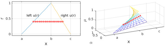 Triangle membership function of a fuzzy number X with the cut at membership level : left graph—parametric fuzzy number (FN), right graph—horizontal FN.