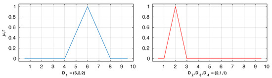 In this problem denotes triangle FN with a core and with a left and right deviation equal to 2 and denotes a FN with a core equal to and both deviations equal to 1. The above FNs are shown in Figure 4.