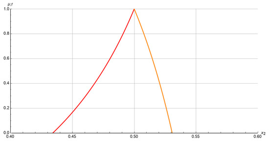 Using the standard approach using Newton’s method and parametric FN representation, the authors of [5,8] achieved only one positive solution (positive root) of Equation (9) in form of the fuzzy number shown in Figure 5.