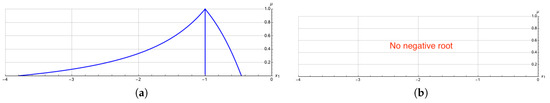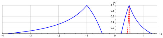 According to the authors of [8] the negative root does not exist. The lack of the negative solution is the consequence of the parametric FN form and the low-dimension fuzzy calculus. Newton’s methods [5,8] found the second root that does not satisfy the third condition in Definition 3 and therefore was rejected. We observe that the low-dimensional fuzzy calculus is imprecise. It is strange that the negative root was rejected, because negative crisp benchmark solutions can easily be found. The span function of the negative root , which is the benchmark (Equation (9)) solution, is shown in Figure 6.