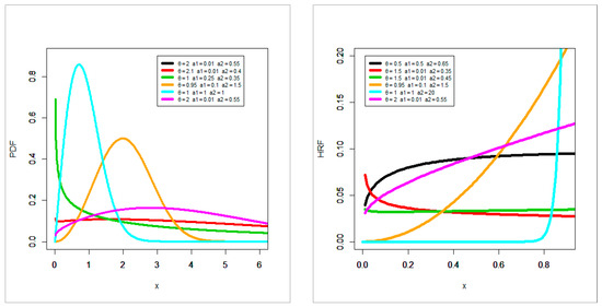 Figure 1 gives some plots of PDF and HRF for the RG-LL model. From Figure 1 (left panel), we conclude that the proposed PDF of the RG-LL model can be “uniform”, “unimodal”, “symmetric” or “asymmetric left skewed” (or asymmetric right skewed (see Table A1)). From Figure 1 (right panel), the HRF can be “asymmetric monotonically increasing” () or “decreasing-constant” () or “J shaped” () or “constant” ().