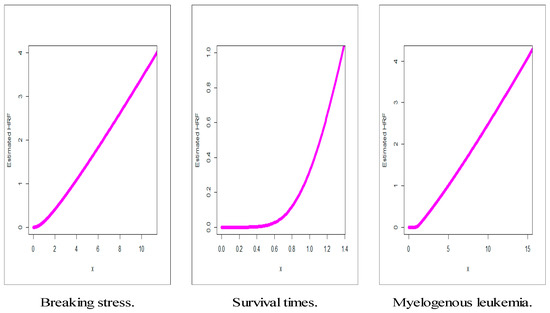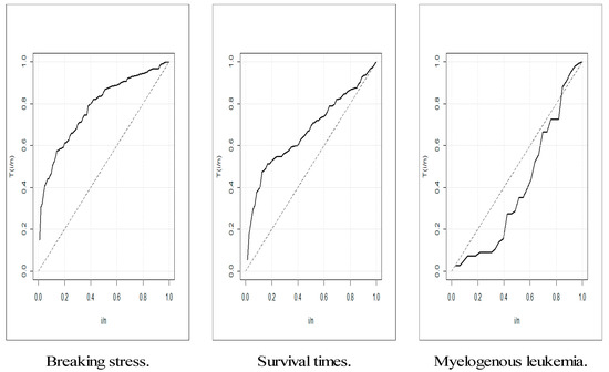 The 3rd data: {65, 156, 100, 134, 16, 108, 121, 4, 39, 143, 56, 26, 22, 1, 1, 5, 65, 56, 65, 17, 7, 16, 22, 3, 4, 2, 3, 8, 4, 3, 30, 4, 43} is called “leukemia data”. This real data set gives the survival times, in weeks, of 33 patients suffering from acute myelogenous leukemia. The total time test (TTT) plot (see [40]) is an important graphical approach to verify whether the data can be applied to a specific distribution or not. The TTT plots of the three real datasets are presented in Figure 2. This plot indicates that the empirical HRFs of the 1st and 2nd datasets are increasing. The empirical HRF is the bathtub for the 3rd dataset.