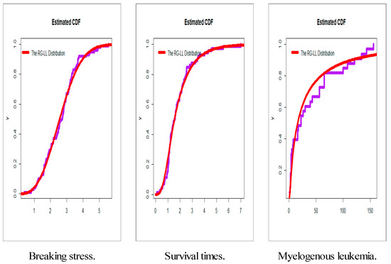 Based on the values in Table A3, we conclude that the RG-LL model provides the best fit as compared to other competitive models in the three applications with the smallest values of , , and . Based on the values in Table A4, it is noted that the RG-LL model provides the best fit as compared to other competitive models in the three applications with the smallest values of , , and . Based on the values in Table A5, it is noted that the RG-LL model provides the best fit as compared to other competitive models in the three applications with the smallest values of , , and . Figure 2, Figure 3, Figure 4 and Figure 5 give the total time in test (TTT) plots, the estimated CDFs plots, the estimated PDFs plots, and the estimated HRFs plots, respectively. Based on Figure 2, the HRF of the three data are “monotonically increasing”, “monotonically increasing”, and “decreasing-constant-increasing”, respectively. Figure 3, Figure 4 and Figure 5 are provided for illustrating the superiority on the new model graphically.