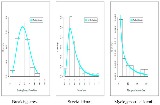 The new model is used for modeling three real datasets. The 1st data are an “engineering real-life data” and consist of 100 observations of “breaking stress of carbon fibers” given by [8]. The 2nd data are a “reliability survival data” and called the “survival times”, in days, of 72 guinea pigs infected with virulent tubercle bacilli, this data were originally observed and reported by [9]. The 3rd data are medical data and called leukemia data. This real dataset gives the survival times, in weeks, of 33 patients suffering from acute myelogenous leukemia. These applications are used to illustrate the importance, potentiality, and flexibility of the RG-LL model. The hazard rate function (HRF) of the 1st and 2nd real datasets is “monotonically increasing”. However, the HRF of the 3rd is “decreasing-constant-increasing”. These read datasets are analyzed by [10,11,12,13,14,15,16,17].