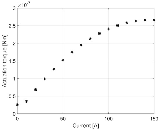 It can be noted that the actuation torque versus current curve is rather linear for currents up to 100 A. In fact, the linear behavior of the actuation torque is one of the advantages of magnetic MEMS.