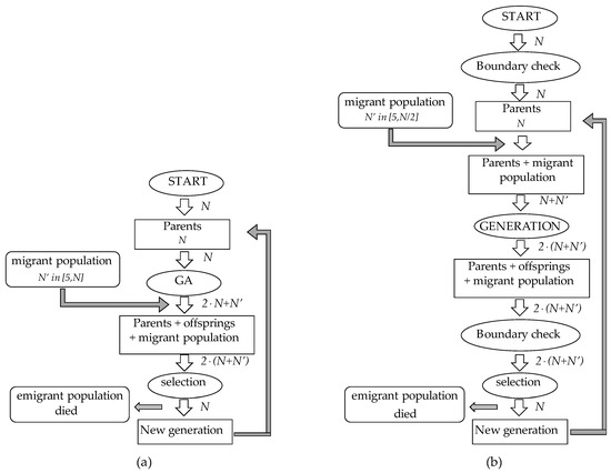 In the NSGA-II algorithm at each generation, a population of N parents generates up to N sons (up to 2N individuals after generation step) that, after a selection step, produce a new population of N individuals [43]. In the M-NSGA algorithm, a new population [47,50,51], with a size variable in number of individuals from 5 to N, immigrates after the generation step, so improved individuals could modify the genetic heritage of the original population if they survive after selection. The flow chart is shown in Figure 6a. In the MP-NSGA algorithm, immigration occurs before generation step, so the genetic heritage of the migrated population can affect the successive generation step of the new individuals. Moreover, in this case, the size of the immigrated population is smaller, and the number of individuals is variable between 5 to N/2: then, the generation can generate up to 3N/2 new individuals. The proposed version of the M-NSGA algorithm includes the check of three problem boundaries. In case a solution does not satisfy even one of the constraints, all the objective functions are set to 1010. This way, these individuals are discarded during the selection step. The flow chart of the bounded version of the MP-NSGA algorithm is shown in Figure 6b. The algorithm stops after a given number of generations.