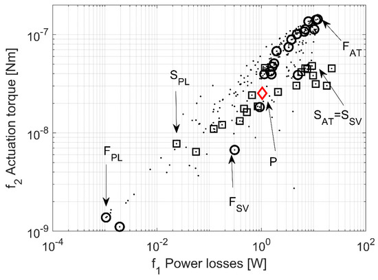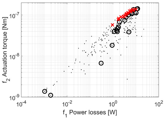 Looking at the results, the following comments can be put forward. From Table 3, it can be noted that the solutions with the lowest power losses are characterized by relatively thick magnets (high values of magnet thickness x1), and rather thin coils (low values of x4) carrying a low current (low values of x7). The length of the coils and the distance between them (design variables x5 and x6, respectively) have values in the middle of the feasible range. From Table 4, it can be noted that the solutions with a higher actuation torque have thick magnets (high values of magnet thickness x1), small intercoil distance (low values of variable x6) and high current values (variable x7).