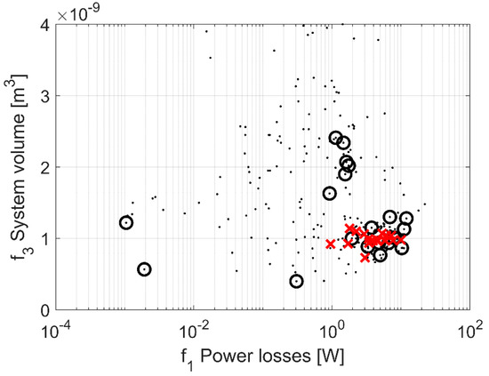 f1–f3 projection of the objective space: dot—individuals, cross–NSGA-III solutions, circle—MP-NSGA solutions.