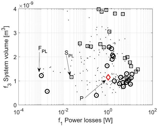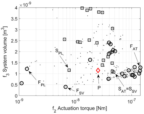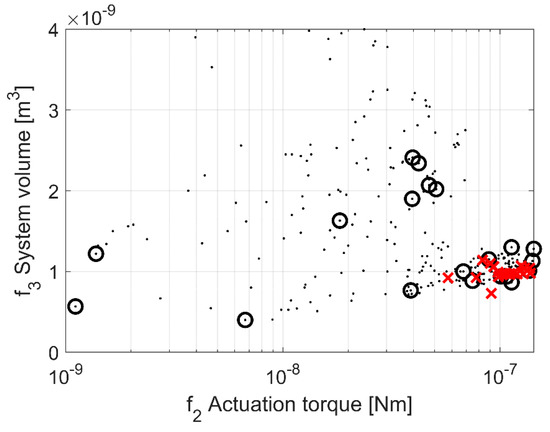 The tri-objective formulation [35] reads: having prescribed lower thresholds for holding torque (10−8 Nm) and actuation torque (10−9 Nm), given the mirror position φ = 10°, find the geometry of magnet and conductors, as well as the current pulse amplitude, such that power loss in conductors (f1), weighted material cost (f2), and excitation system volume (i.e., conductors and magnet, f3) are simultaneously minimized in the Pareto sense.