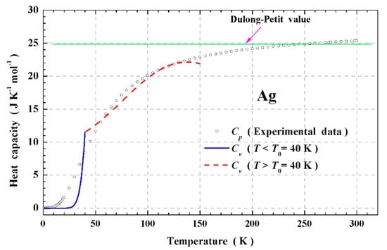 The experimental data were taken from [18,19,20] in the temperature range from 1 to 300 K. We used the conversion factor of gas constant = 8.314 J K−1 mol−1, where = 6.022 × 1023 mol−1 is Avogadro’s number and = 1.381 × 10−23 J K−1 mol−1 is the Boltzmann constant. The Cp value approaches the classical Dulong–Petit value 3NAkB = 24.94 J K−1 mol−1 [14,15,20] as the temperature approaches 250 K, above which Cp exceeds the classical value due to the lattice anharmonic contributions in the potential energy. The open circles represent the experimental molar heat capacity, while the blue solid and the red dashed lines denote the calculated ones below and above the possible phase-transition temperature (To = 40 K) in Equation (13), respectively. Our analysis of the data may support the possibility of superconducting silver.