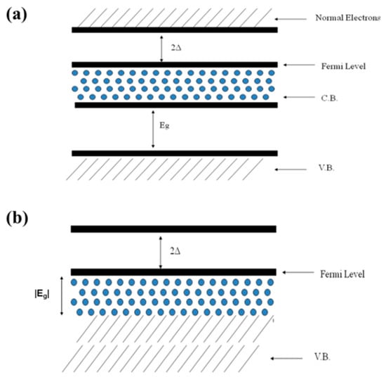 The band gap Eg and the superconducting gap 2Δ are shown, where C.B. and V.B. denote the conduction band and the valence band, respectively: (a) at superconducting states according to conventional models; (b) at superconducting states according to our model.