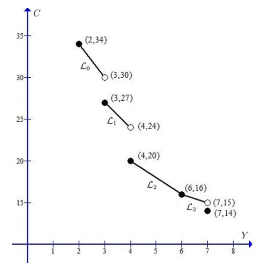 Let us consider the job instance  displayed in Table 3. The trade-off curve of problem  on instance  is shown in Figure 3.