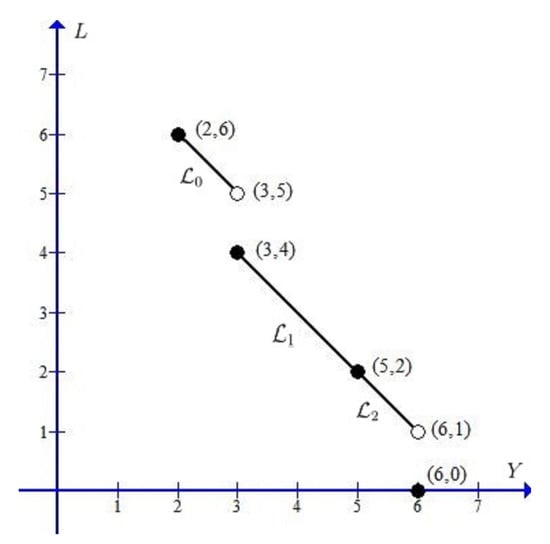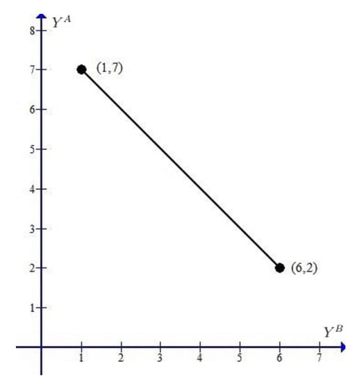 - By using the same method as (i) and (ii), we schedule A-jobs first. Generate the schedule , where . Generate the schedule of in which the B-jobs are preemptively scheduled by running the algorithm in Hariri et al. [] for solving problem in the free-time intervals not occupied by the A-jobs in . Then is a Pareto-optimal schedule corresponding to . From Lemma 10, is the final Pareto-optimal schedule. Then the trade-off curve is just the line segment in the interval , which satisfies as displayed in Figure 3.