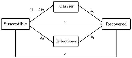 In this model, it is supposed that carrier and infectious devices can both infect susceptible devices by malware at rate a. The fraction of vulnerable susceptible devices endowed with the targeted operative systems that the malware can infect is given by and they become infected. Because of security countermeasures, susceptible devices can be temporally immunized at vaccination rate v. Carriers and infectious devices can recover due to the security measures: the rates and represent these rates, respectively. Recovered devices can lose their temporal immunity at rate (in Table 1 these coefficients are illustrated). As a consequence, the dynamic of the epidemic model is governed by the following system of ordinary differential equations: