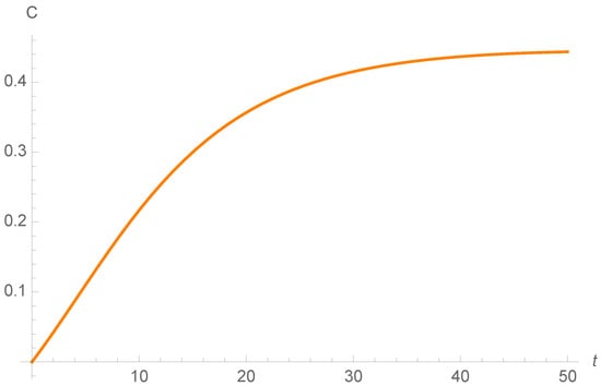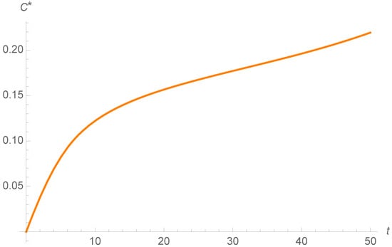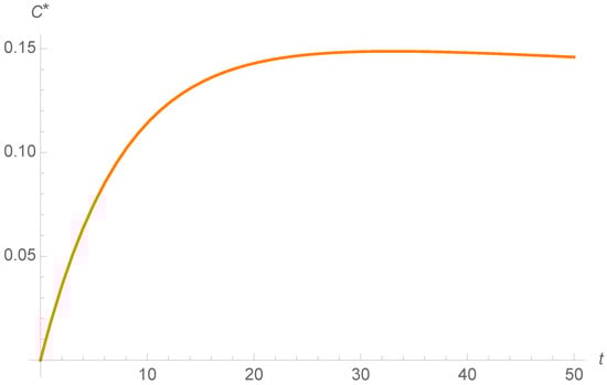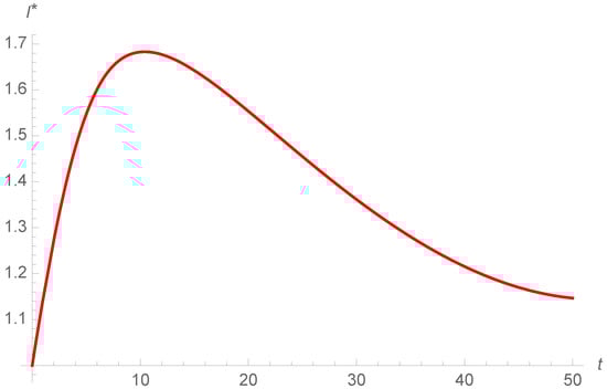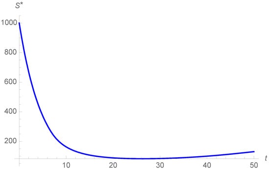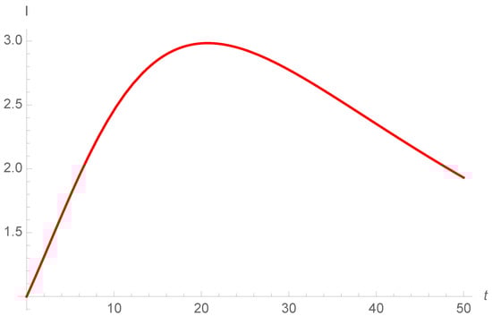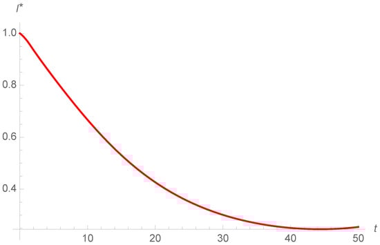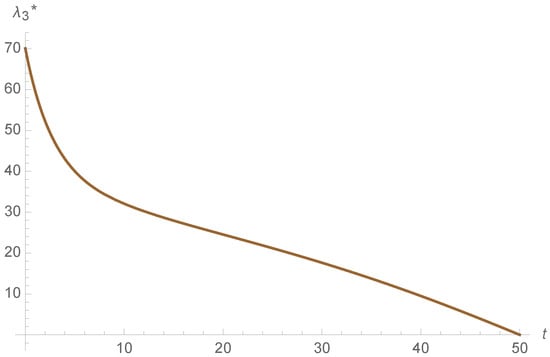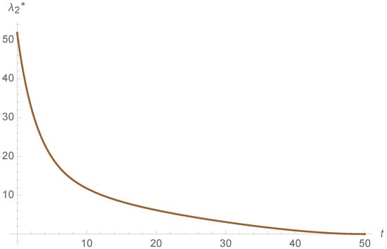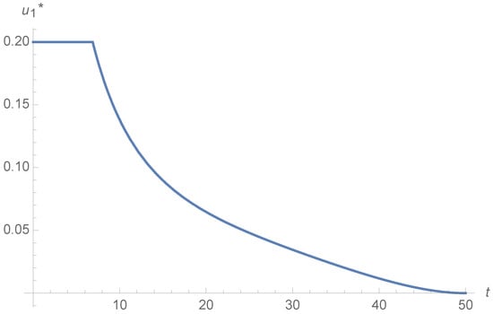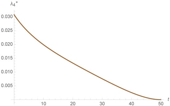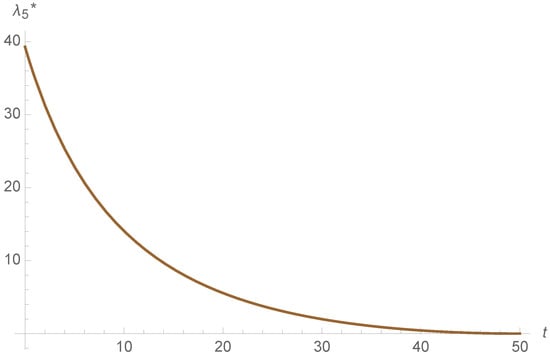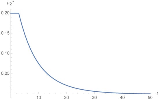 In this section, we analyze some simulations with our control measures, when considering the derivatives of the adjoin functions and the movement equations as an unique system ordinary differential equations with the optimal control. Moreover, the following numerical values of the parameters are considered: , , , , , , , , , , , and . The solutions of the system are shown in Figure 2, Figure 3, Figure 4, Figure 5, Figure 6, Figure 7, Figure 8, Figure 9 and Figure 10. The simulations have been obtained using the computer algebra system Mathematica and, specifically, the function NDSolve used to solve in a numerical way the systems of ordinary differential equations.