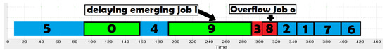In Table 1 and Table 2 we give a small randomly generated problem instance with 10 jobs, one of the instances that we have tested during our experiments. The initial ED-schedule σ is represented in Table 2 and Figure 1, in the form of a table and graphically, respectively. It is easy to see that kernel K ( σ ) consists of jobs 3 and 8 (8 is the overflow job), jobs 0 and 9 are emerging jobs. Table 3 represents a modified problem instance, in which the release time of the delaying emerging job 9 is artificially increased. The result of the application of ED-heuristics to that modified instance is a complementary schedule σ 9 represented in Table 4 and Figure 2. The optimal schedule for the instance is depicted in Figure 3. The kernel of that schedule consists of a single job 5, which is also the overflow job; there exists no emerging job in that schedule.