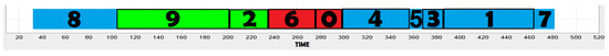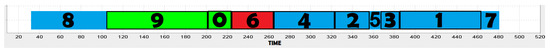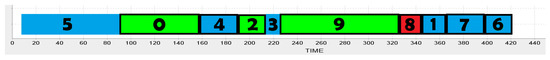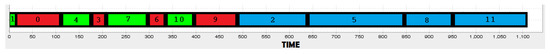 Figure 7. Optimal solution for E_1_12, the red jobs are of type α , the green jobs are of type β and the blue jobs are of type γ .