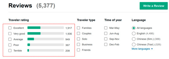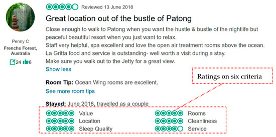 As a type of emerging information resource on the website, online hotel reviews have their uniqueness, such as public availability, and have an important impact on hotel selection [23]. According to the online reviews, researchers studied tourists’ basic requirements and preferences of hotels [24], and travel platforms could offer hotels’ ranking to help tourists choose a satisfying hotel [25,26,27]. Online hotel reviews contain review ratings and review texts [28]. Review ratings are a quantitative evaluation and review texts are in-depth qualitative analysis of hotels [29]. The lengthier review texts are more useful and enjoyable than shorter review texts [30]. However, the correlativity between ratings and hotels list can help tourists choose a hotel in a much simpler and more intuitive manner, and review texts that include less valuable information may have bad readability [29]. Thus, considering determinacy of ratings and complexity of texts, we focus on online hotel review ratings to conduct a case study in Section 5.