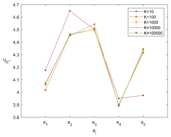 (3) The weights of the criteria is another influencing factor in the decision process. The ranking results cannot be calculated in the case that the weights are unknown or some constraint conditions of weights are known in Method 1 and Method 2. However, the proposed approach can be used to deal with the PLMCDM problems that weights are partly known or some constraint conditions of weights are known. If there are several weight vectors satisfying known conditions, all these weight vectors can be used to calculate the final ranking result. In this paper, for avoiding the case that overmuch weight vectors may injure the calculation efficiency of the proposed approach, parameter is defined as the number of weight vectors and used to control the decision process. A reasonable can ensure stability and calculation efficiency of the proposed approach simultaneously.