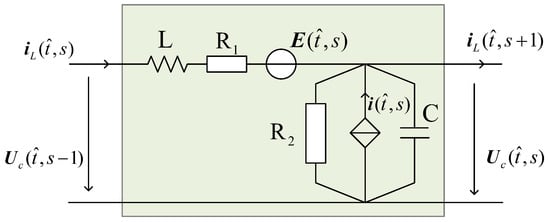 Take as the sampling period, and t represents the discrete time. Let the information exchanged by each subsystem be the respective inductor current and capacitor voltage, in other words, , , , .