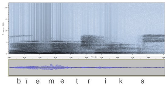 Bottom: Waveform of the sounds of the word “biometrics,” where you can see the consistency in time of each sound that makes it up. Top: Spectrogram of the time-dependent Fourier transform of the waveform.