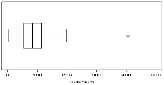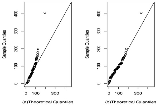Table 3 shows some descriptive statistics for the data set, where and denote the skewness and kurtosis coefficients, respectively, of the sample. In this respect, we highlight the high kurtosis of this data. Figure 3 presents a boxplot for the data, where an atypical observation is noted. From the results in Section 3.1, the moment estimates for the parameters of the SPM model are , and . These estimates are used as the initial values needed to implement estimation by the ML method using the numerical method.