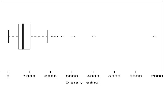 The real data were obtained from a cross-sectional study to investigate the relation between personal characteristics and dietetic factors dietéticos, and plasma concentrations of retinol, beta-carotene, and other carotenoids in 315 patients. The data set is available online at “http://lib.stat.cmu.edu/datasets/Plasma_Retinol” and contains 14 variables. The data consist of dietary retinol consumed by 315 patients (mcg per day). Table 5 shows some descriptive statistics for the data set, in which we highlight the very high kurtosis of the data. Figure 5 presents a boxplot for the data, which shows that there are several outliers. From the results in Section 3.1, the moment estimates for the parameters of the SPM model are , and . These estimates are used as initial values for calculating the ML estimates.