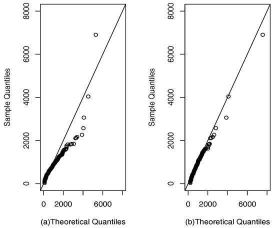 In Table 4, we compare the SPM and PM models. We calculated the Akaike information criterion AIC (see Akaike [20]) and the Bayesian information criterion BIC (see Schwartz [21]). It can be seen that AIC and BIC show a better fit of the SPM model, and the qqplots in Figure 4 show that the SPM model fits better than the PM model.