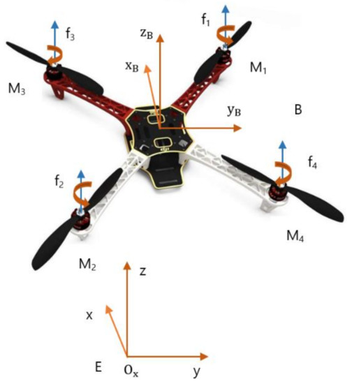 Figure 1 illustrates the configuration of a quadcopter. Four propellers are mounted on the corresponding motors in a cross configuration. While the motors and spin in the clockwise direction, the other motors ( and ) spin in the counter-clockwise direction. The forces generated by the motors are represented as and the corresponding angular velocities produced by the motors are denoted as .