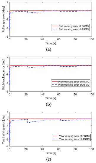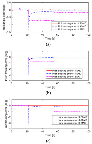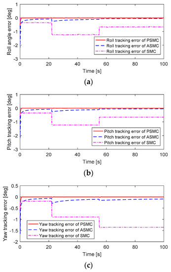 Attitude tracking error performance without considering any uncertainties and disturbances: (a) Roll tracking error; (b) Pitch tracking error; (c) Yaw tracking error.