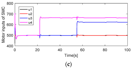 When faults occur in actuators #4 and #3, the PSMC can compensate for these faults perfectly to maintain the attitude tracking performance, and the attitude tracking errors converge quickly to zero. Although ASMC shows a small oscillation after the occurrence of these faults, the feedback attitude angles can gradually track the desired attitude angles. The SMC showed the worst attitude tracking response after faults occurred. The motor inputs of the quadcopter are depicted in Figure 7. After faults occur, the motor inputs in actuators #4 and #3 were increased to accommodate these faults. The PSMC contributes more control efforts than ASMC and SMC because of the adaptive gain in the discontinuous part.