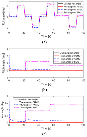 Attitude tracking performance without considering any uncertainties and disturbances: (a) Roll angle; (b) Pitch angle; (c) Yaw angle.