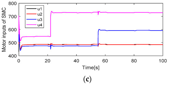 In this scheme, faults are injected into actuators #4 and #3 under 20% and 25% loss of control effectiveness (LoCE) at 22 s and 52 s, respectively. The attitude tracking and attitude tracking errors without considering uncertainties and disturbances are depicted in Figure 2 and Figure 3. After faults occur in actuators #4 and #3, the PSMC can compensate for these faults perfectly to maintain the attitude tracking performance, and the attitude tracking errors converge quickly to zero. Although ASMC shows a small oscillation after the occurrence of such faults, the feedback attitude angles can gradually track the desired attitude angles. The SMC showed the worst attitude tracking response after faults occurred. The motor inputs of the quadcopter are depicted in Figure 4. After faults occur, the motor inputs in actuators #4 and #3 are increased to accommodate these faults. The PSMC contributes more control efforts than ASMC and SMC because of the adaptive gain in the discontinuous part.