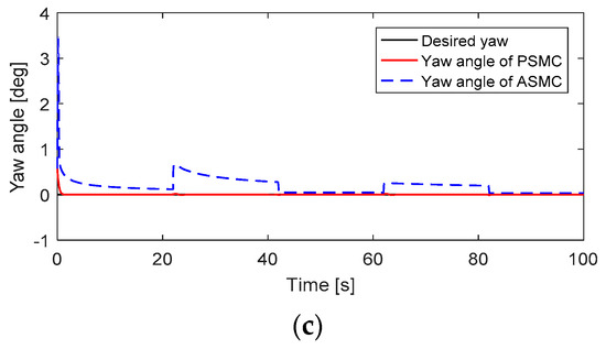 Attitude tracking performance: (a) Roll angle; (b) Pitch angle; (c) Yaw angle.
