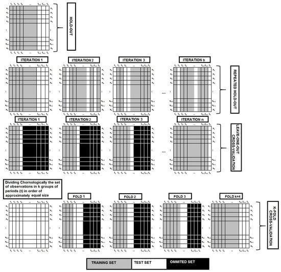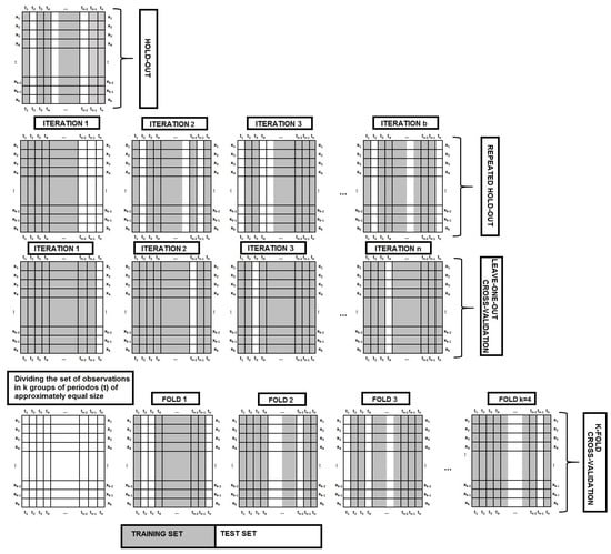 A variation of the hold-out method is known as the repeated hold-out method [], and it involves repeating the hold-out several times, as seen in Figure 2. This technique allows for testing the model b times, where b is the number of times that the sample is randomly subdivided into alternative training and validation sets. The measure of the forecasting ability of the model when applying the repeated hold-out method is the average of each of the b measures of the goodness of fit: