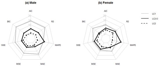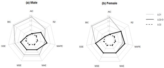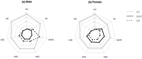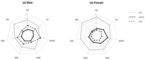 Radar graph summarizing the number of countries for which each model (LC, LC2, and LC2-O) achieves the best forecasting ability according to the hold-out method for males (a) and females (b).